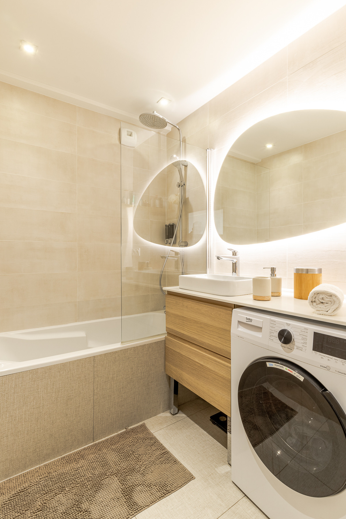The bathroom, with its bathtub/shower and cleverly arranged vanity unit, offers a well-thought-out relaxation space. The separate toilets add an extra note of convenience.
