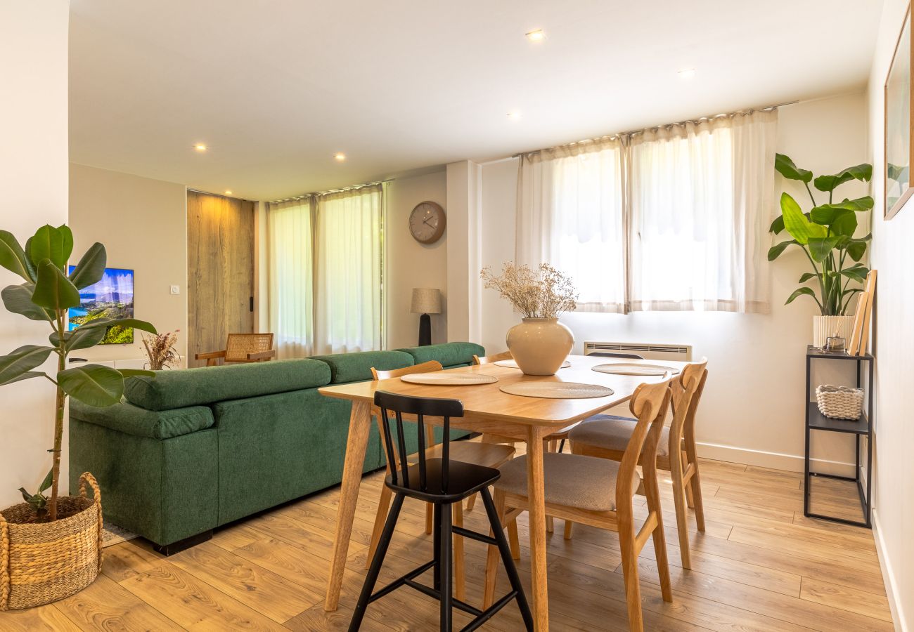 The heart of the apartment is undoubtedly the spacious and bright living room. This area, designed for relaxation and conviviality, invites you to unforgettable moments of sharing. Whether for a movie night, a dinner with friends, or simply a moment of reading, you'll feel right at home. The adjoining dining room perfectly complements this warm setting, comfortably accommodating five people.